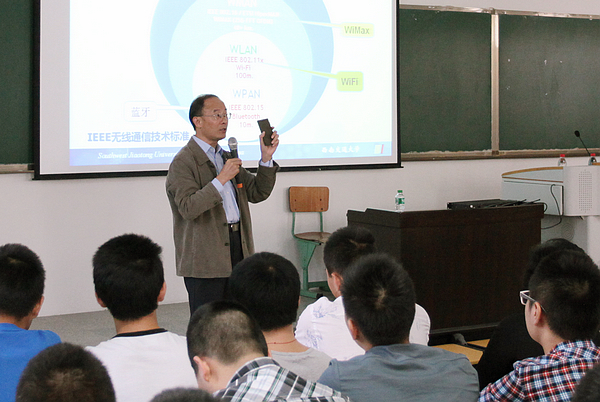 在讲座中,范平志教授提到了无线通信与我们的化工行业、自动化、计算机专业都有着紧密的联系,无线通信在现实生活中无处不在。并分别从无线通信技术发展概述、短距离无线通信与无线传感网、公众蜂窝通信与宽带无线接入、专用通信与高铁无线通信技术等几个方面做了详细讲解。最后,在王院长的主持下,各位师生踊跃发言并提问,内容涉及学院相关专业知识、课堂管理、教学方法、通信安全等各个方面,范教授用朴实生动的语言一一做了精彩解答。