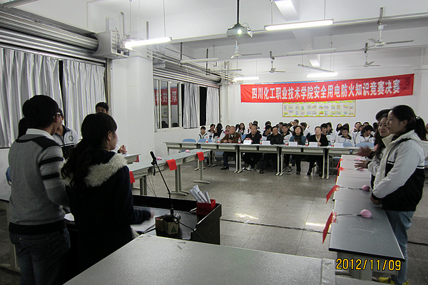 11月9日晚7点,由后勤总公司、保卫处、学生处、院团委主办的“安全用电防火知识竞赛”决赛在实训楼B区304举行,后勤总公司王晓霞副总经理、学生处罗泽洪副处长、保卫处李祖贵老师等出席比赛并担任大赛的评委。