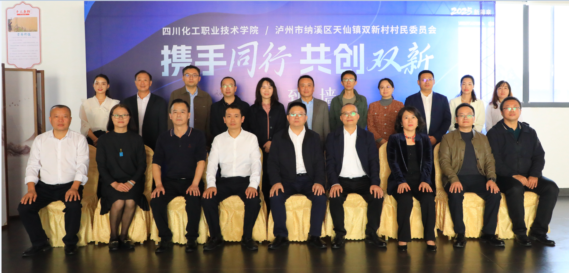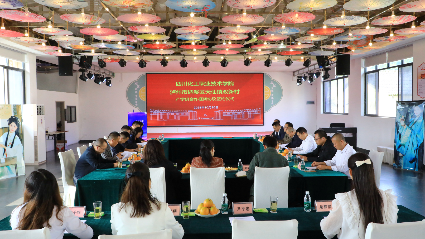 为推动学校专业和人才优势与地方产业产学研深度融合,2025年10月30日下午,学校与纳溪区天仙镇双新村举行产学研合作框架协议签约仪式。泸州市纳溪区人民政府副区长陈瑚、区委组织部副部长刘东鑫、纳溪区天仙镇党委书记周全、天仙镇双新村党支部书记李强、四川酩创科技有限公司总经理杨磊,学校党委副书记、院长文申柳,党委委员、副院长徐丽萍参加仪式。天仙镇党委委员、副镇长吴涛主持签约仪式。