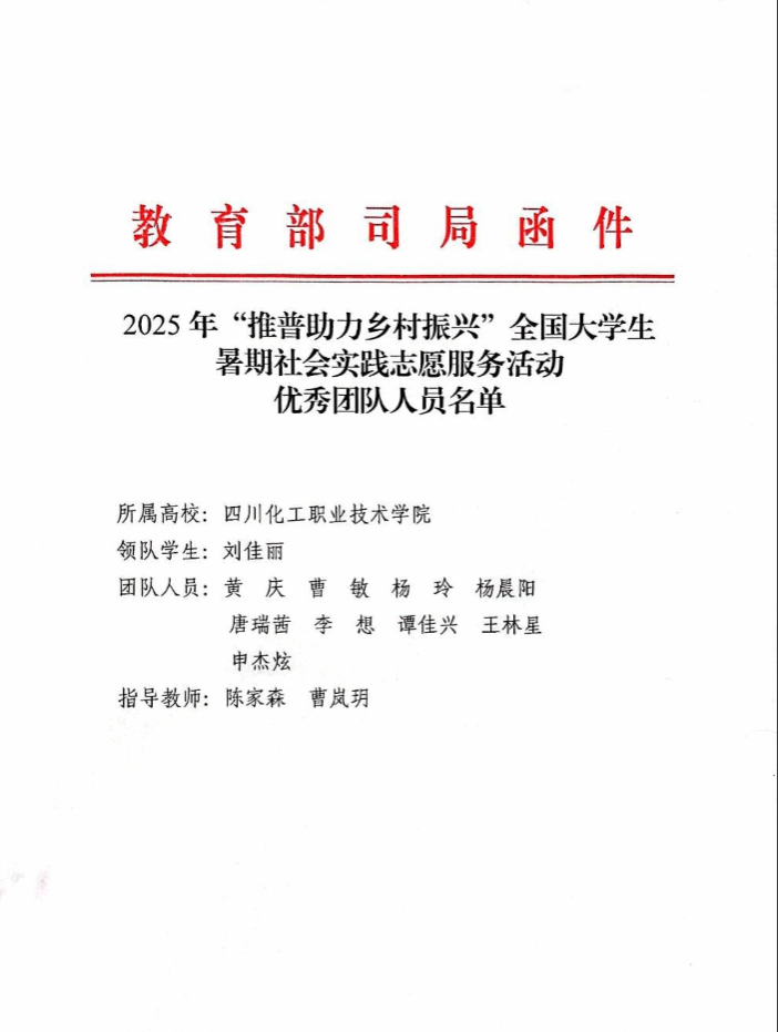 近日,教育部语言文字应用管理司与共青团中央青年发展部联合公布了2025年“推普助力乡村振兴”全国大学生暑期社会实践志愿服务活动优秀团队评选结果。学校应用化工学院“推普筑梦·多维振兴”志愿服务团凭借扎实的工作成效、创新的活动形式和富有影响力的实践成果,在全国2000余支团队中脱颖而出,荣获“优秀团队”称号,并获两部委通报表扬。这不仅是对学校实践育人成果的充分肯定,更是我校积极服务国家战略、履行社会责任、推动人才培养与社会发展深度融合的重要体现。