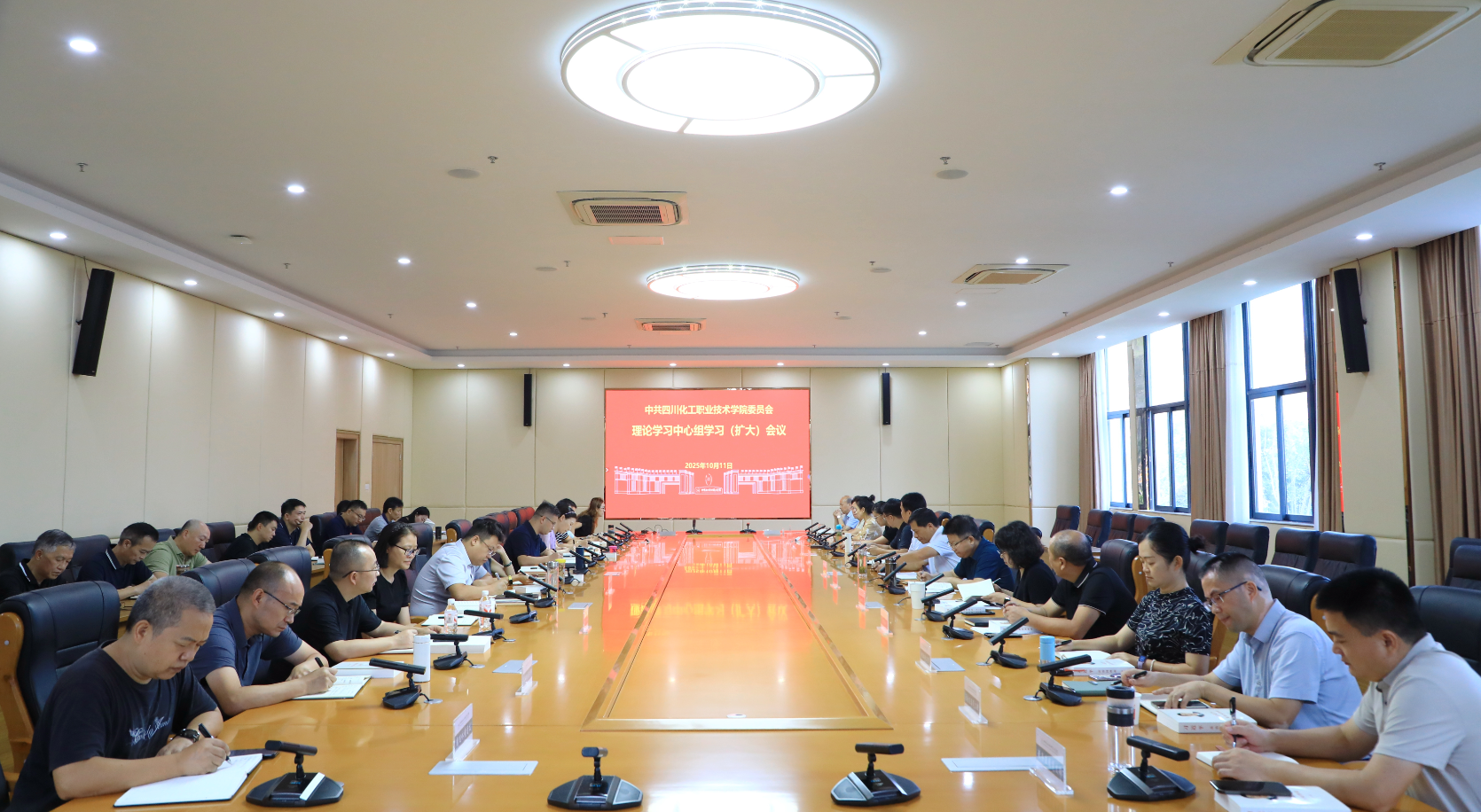 2025年10月11日,学校在综合办公楼第一会议室召开理论学习中心组学习(扩大)会议。学校党委书记邓华云主持会议并讲话。学校党委理论学习中心组成员、中层正职及以上干部(含主持工作副职)、各党总支(直属党支部)负责人参加会议。