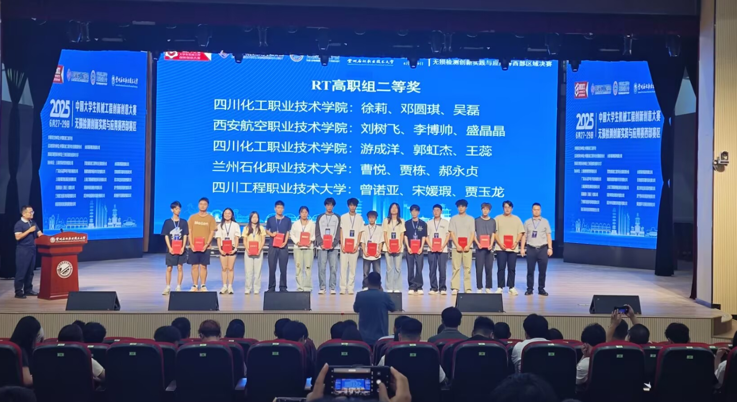 2025年6月27日至29日,由中国机械工程学会主办的2025年中国大学生机械工程创新创意大赛无损检测创新实践与应用赛西部区域赛决赛在兰州石化职业技术大学顺利举办。来自西部区域包括西南石油大学、四川工程职业技术大学等19所院校的76支参赛团队228名选手参加决赛。经过激烈角逐,学校由机械工程学院检测专业教师刘海、陈星红带队的4支队伍12名学生全部获奖并晋级全国总决赛,其中荣获“一等奖”2项、“二等奖”2项,其中一支获一等奖的队伍更是取得大赛第一名的好成绩,这也是学校学生连续2年斩获该赛项第一名,刷新了我校在无损检测创新实践与应用赛项的获奖数量记录,为学校争得了荣誉。