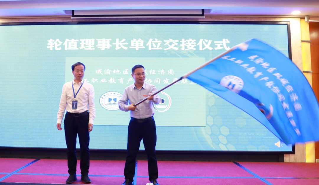 随后举行了理事长单位交接仪式,学校党委书记刘志勇向重庆化工职业学院党委副书记、院长李廷真移交联盟会旗。